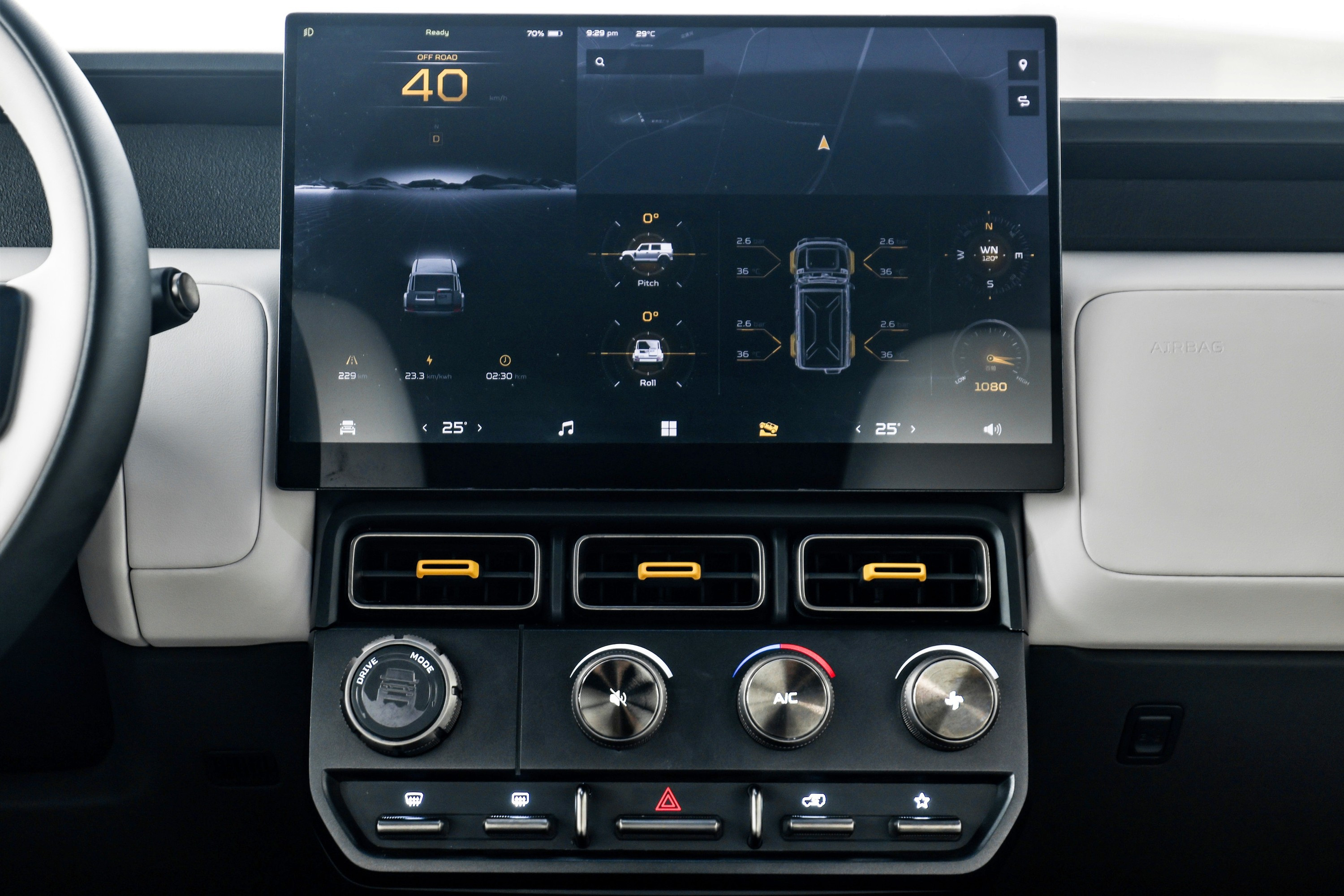 Салон iCar V23 имеет примерно ту же квадратно-гнездовую архитектуру, что салон iCar 03, но отличается от последнего более кондовым дизайном и имеет отдельный блок микроклимата с тремя классическими вращающимися рукоятками — для современных китайских машин это редкость несусветная. Квадратная нашлёпка на распашной двери багажника имеет встроенный фонарь и предназначена для хранения зарядного кабеля.
