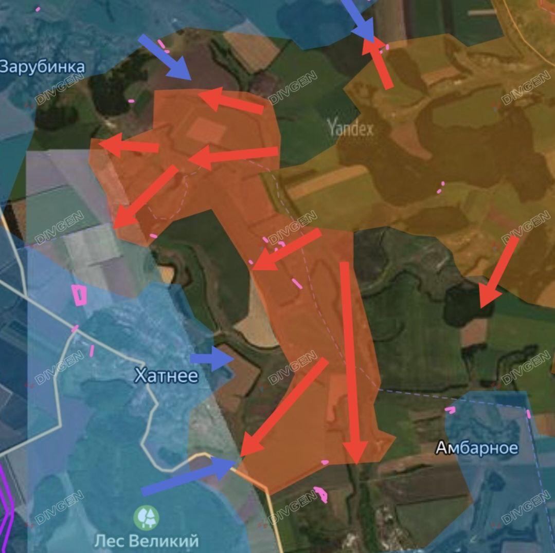 На Великобурлукском участке нашим подразделениям в условиях постоянных контратак противника удалось переправиться на западный берег р. Верхняя Двуречная и продвинуться в посадках и лесных массивах местами свыше 2,5 км между н.п. Хатнее — Амбарное (перерезав дорогу на Колодезное) и Хатнее — Долгенькое, охватывая Хатнее по флангам севернее и южнее.