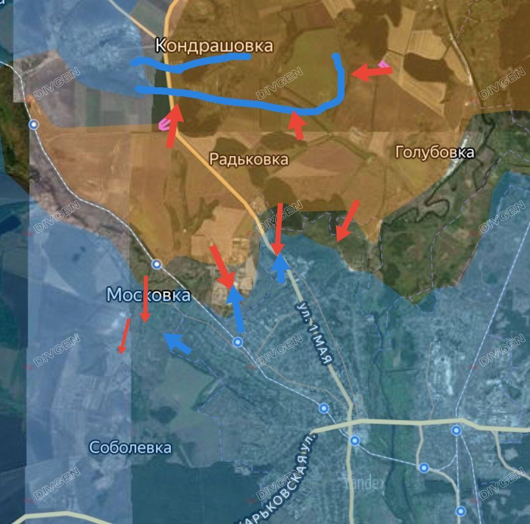 Продолжаются бои в районе Кондрашовки, которая частично остаётся за противником, и в посадках севернее Радьковки.