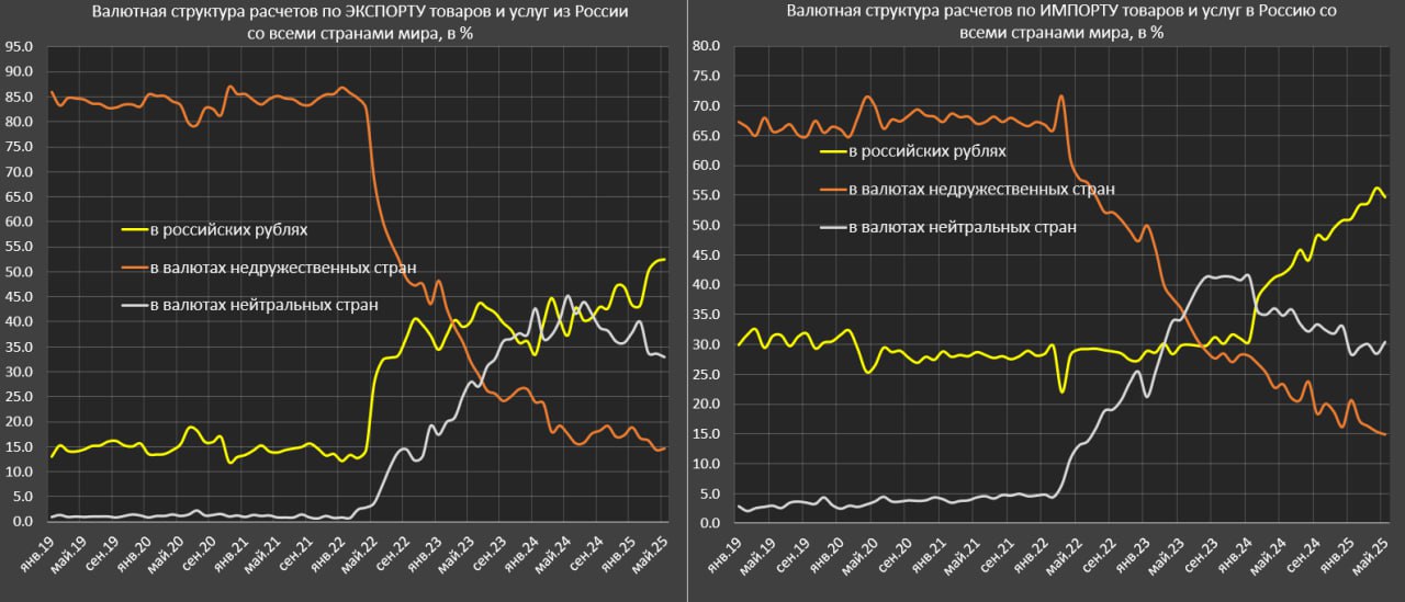 В оплату импорта товаров и услуг в валютах недружественных стран ушло $24.9 млрд ($43.6 млрд в валютах нейтральных странах) за 5м25, $36.3 ($52.7 млрд) за 5м24 и $65 млрд ($45.4 млрд) за 5м23.