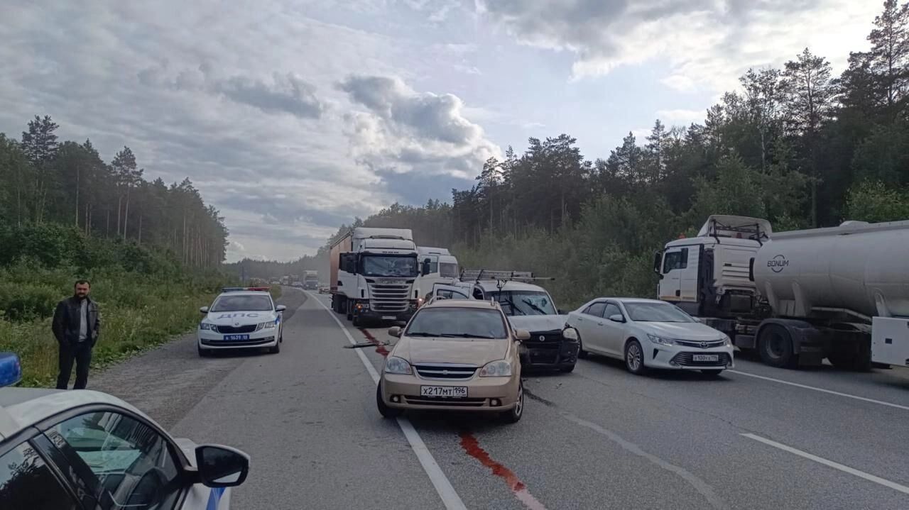 Вечером во вторник, 24 июня, на ЕКАД в районе 45-го километра произошла серьезная авария. Грузовик Scania с полуприцепом въехал в три автомобиля, которые стояли в пробке. Столкновение затронуло Fiat Doblo, Chevrolet Lacetti и Hyundai Starex, рассказали в пресс-службе региональной Госавтоинспекции.
