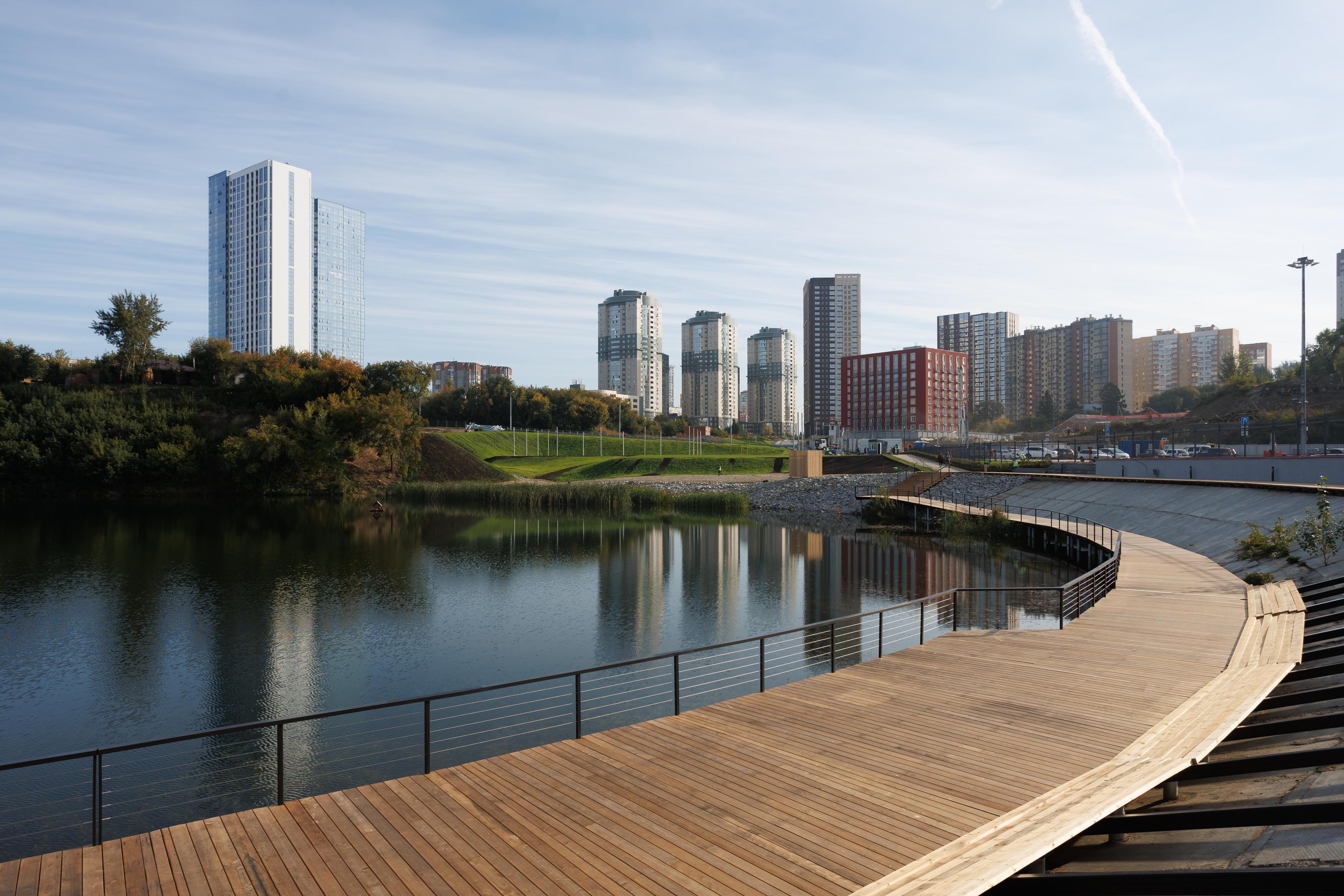 Сейчас застройщик обустроил первую очередь набережной со стороны «Локомотив-Арены». Работы, уточняют в пресс-службе, длились с мая по август. Специалисты выложили променад из дерева длиной около 700 метров, вдоль дорожек установили ограждения и светильники, также обустроили амфитеатр и новую лестницу, которая ведет к озеру от Ипподромской магистрали.