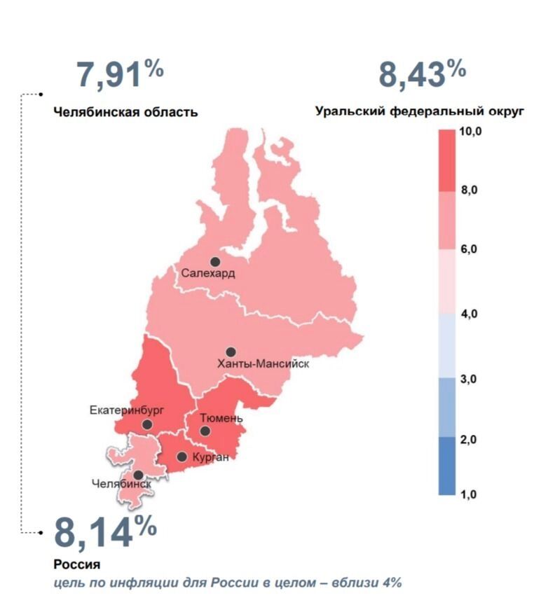Годовая инфляция в России снижается, но пока остается выше целевого уровня. Банк России прогнозирует, что инфляция будет постепенно замедляться, а цель в 4% планируется достичь к 2026 году. В Челябинской области позитивную роль продолжает играть фактор урожая, однако давление на цены сохраняют рост издержек производителей и коммунальные тарифы.