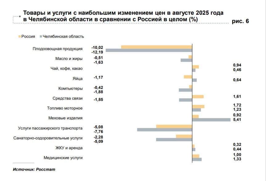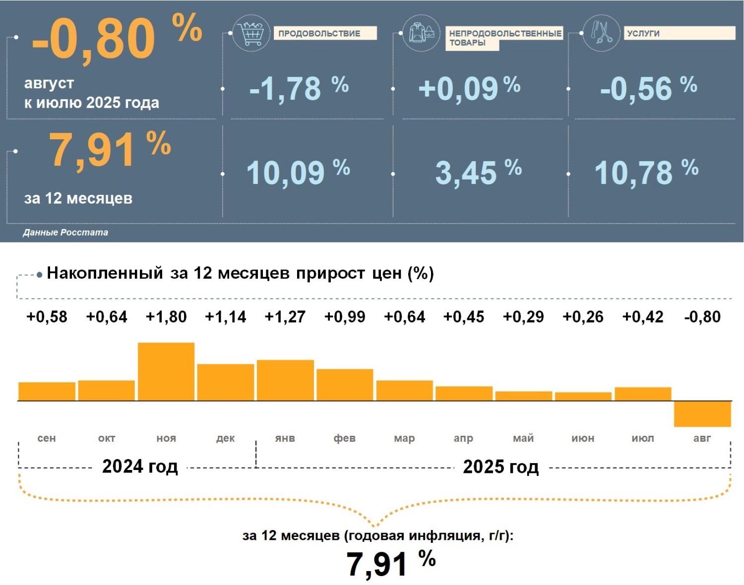 В Челябинской области в августе 2025 года, по данным Росстата, цены упали на 0,80% по сравнению с июлем. Годовая инфляция снижается третий месяц подряд и в августе составила 7,91%. Это меньше, чем в среднем по стране (8,14%).