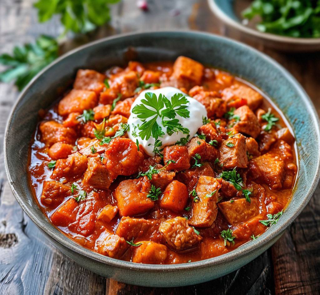 4. Добавить томатную пасту, хорошо перемешать. Влить в гуляш 2-3 стакана воды или мясного бульона, перемешать, добавить лавровый лист, накрыть крышкой и тушить на маленьком огне, при слабом кипении час-полтора.