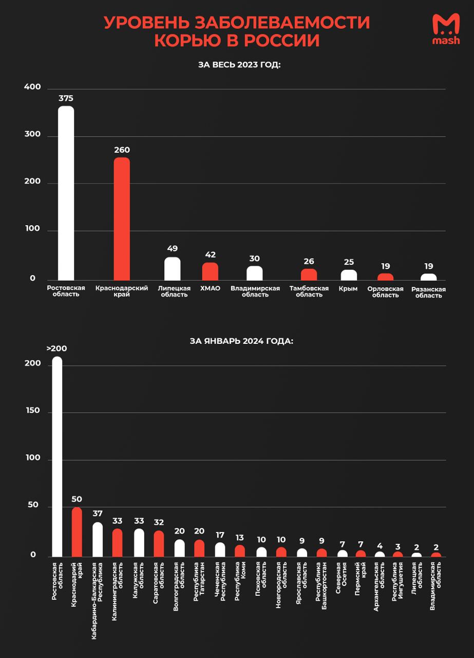 Заболеваемость корью в России выросла в 79 раз по сравнению с 2022-м. А самое большое количество заражённых в этом году, как стало известно Mash, — в Ростовской области и Ханты-Мансийском АО. Там заболело в два раз больше людей, чем в прошлом году. Причина — баптисты-антиваксеры, цыгане и мигранты.