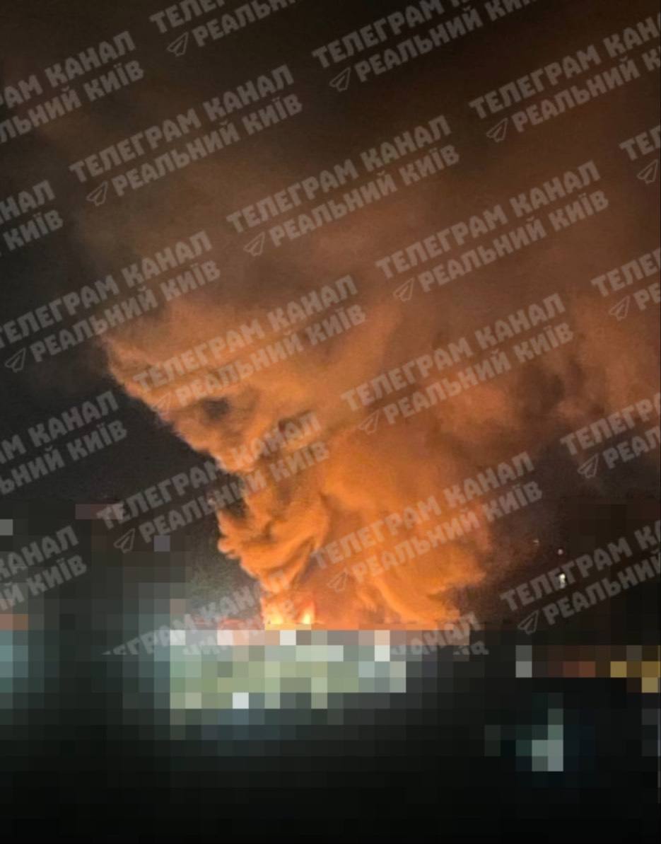 Новые кадры мощного пожара в Киеве после прилёта публикуют местные каналы.