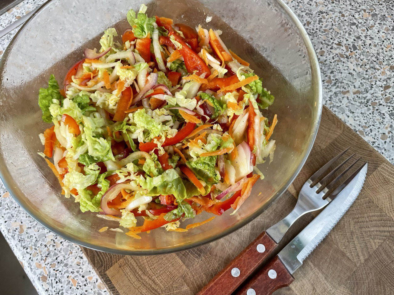 Вкус действительно становится богаче, если дать салату постоять хотя бы часок. На этом, пожалуй, пока всё! Пробуйте и пишите в комментариях, понравилось ли вам это сочетание вкусов так же сильно, как нравится мне????