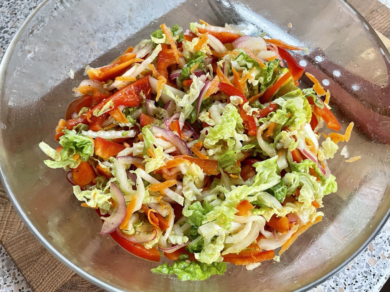 Тщательно перемешиваю овощи с заправкой и даю салату настояться в холодильнике.