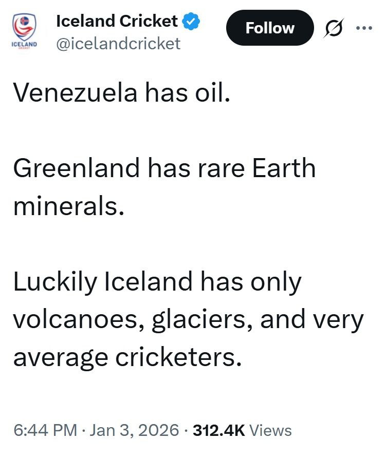 Тем временем официальная страница Исландской Ассоциации крикета: «У Венесуэлы нефть, у Гренландии редкоземы. Слава богу, в Исландии нет ничего, кроме вулканов, ледников и весьма посредственных игроков в крикет».