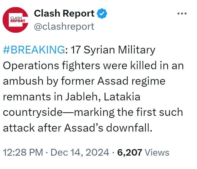 17 бойцов пришедшей к власти в Сирии оппозиции были убиты, попав в засаду остатков армии Асада в сельской местности в Латакии – это первое такое нападение после падения режима бывшего президента.