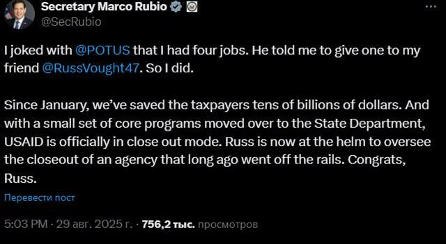 С января мы сэкономили налогоплательщикам десятки миллиардов долларов. А после передачи небольшого набора основных программ в Госдепартамент USAID официально закрывается. Расс теперь у руля, чтобы контролировать закрытие агентства, которое давно сошло с рельсов. Поздравляю, Расс".