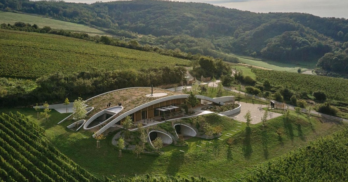 Извилистые линии и зеленая крыша позволили «растворить» масштабный архитектурный объект (винодельня Гурдау, Чехия). | Фото: arch2o.com.