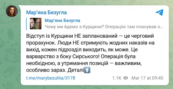 Нардеп Безуглая утверждает, что выход ВСУ из Курской области не был запланирован — приказа на отступление до сих пор не поступало, и подразделения вынуждены выбираться самостоятельно