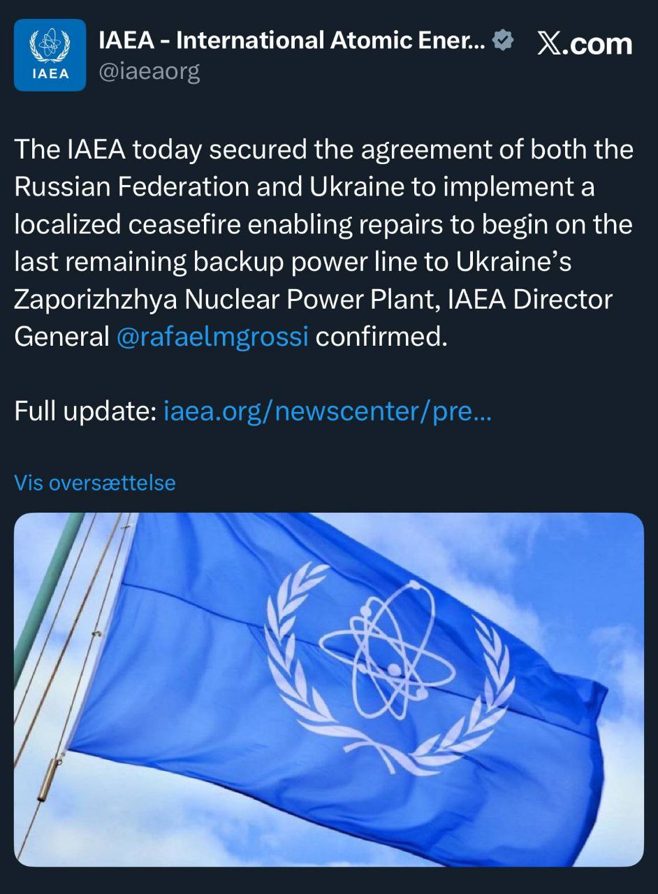 ⚛️ МАГАТЭ объявило, что Россия и Украина договорились о локализованном прекращении огня, чтобы позволить провести ремонт последней оставшейся резервной линии электропередачи, снабжающей Запорожскую атомную электростанцию
