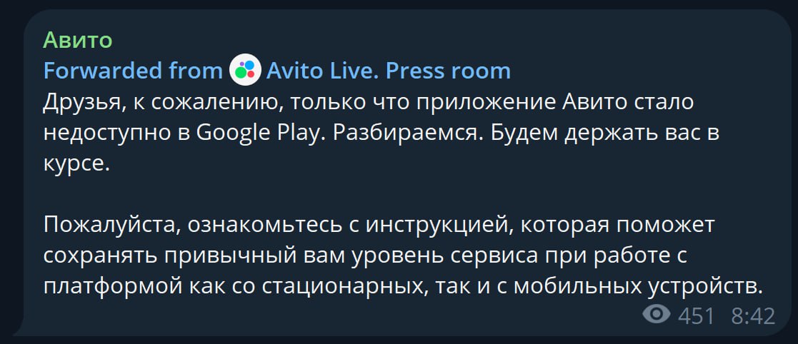 Приложение «Авито» пропало из Google Play Причины удаления выясняются, сообщили в компании. Для тех, у кого приложение уже установлено, практически ничего не изменится. Также появились сообщения о приостановке работы приложения Gmail на iOS. Причины неизвестны. Ранее из Google Play пропало приложение Rutube. Подписывайтесь на «Абзац»