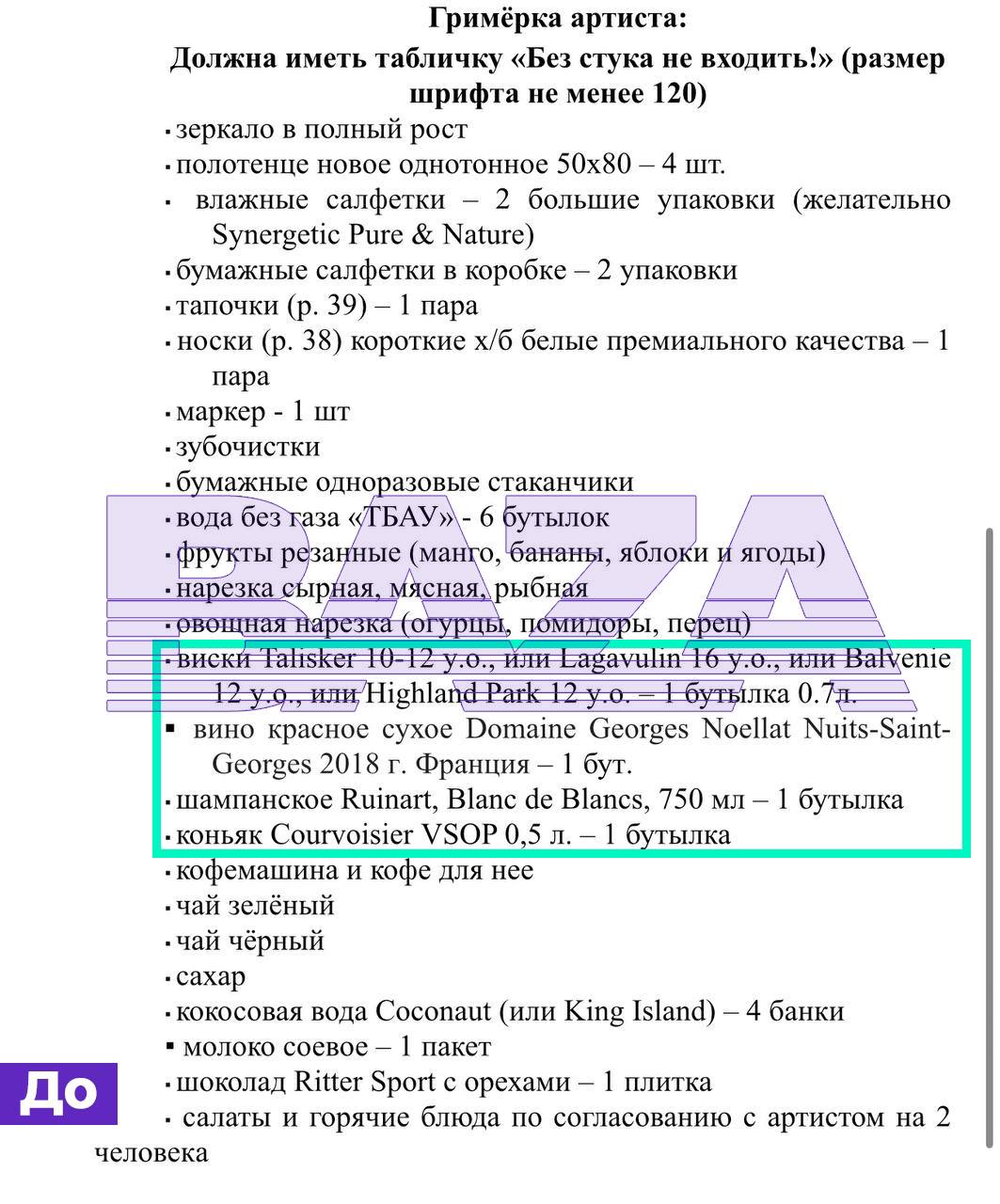 По данным «Базы», ещё полгода назад, наряду со стандартными сырными и мясными тарелками, в райдере Гагариной были указаны 12-летний виски, шампанское Ruinart за 25 тысяч рублей, а также пол-литровая бутылка коньяка Courvoisier VSOP. Но после странного выступления Глюкозы, когда певица не попадала в ноты, ходила по кругу, чесалась и задавала странные вопросы, райдер Гагариной решили отредактировать. На всякий случай.