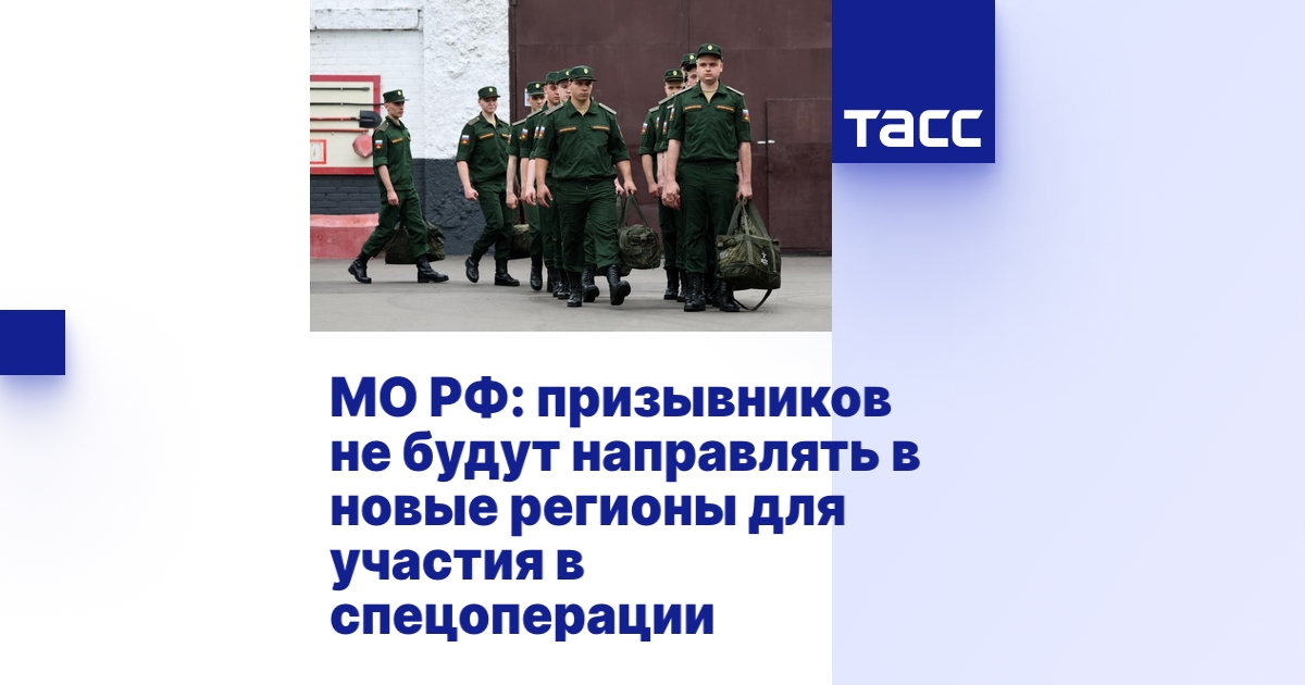 "В пункты дислокации подразделений Вооруженных сил РФ в новых регионах Российской Федерации: Донецкую и Луганскую народные республики, Херсонскую и Запорожскую области или для участия там в выполнении задач специальной военной операции военнослужащие, проходящие военную службу по призыву, направляться не будут", - подчеркнул он в ходе брифинга по теме начала с 1 октября призыва граждан на военную службу.