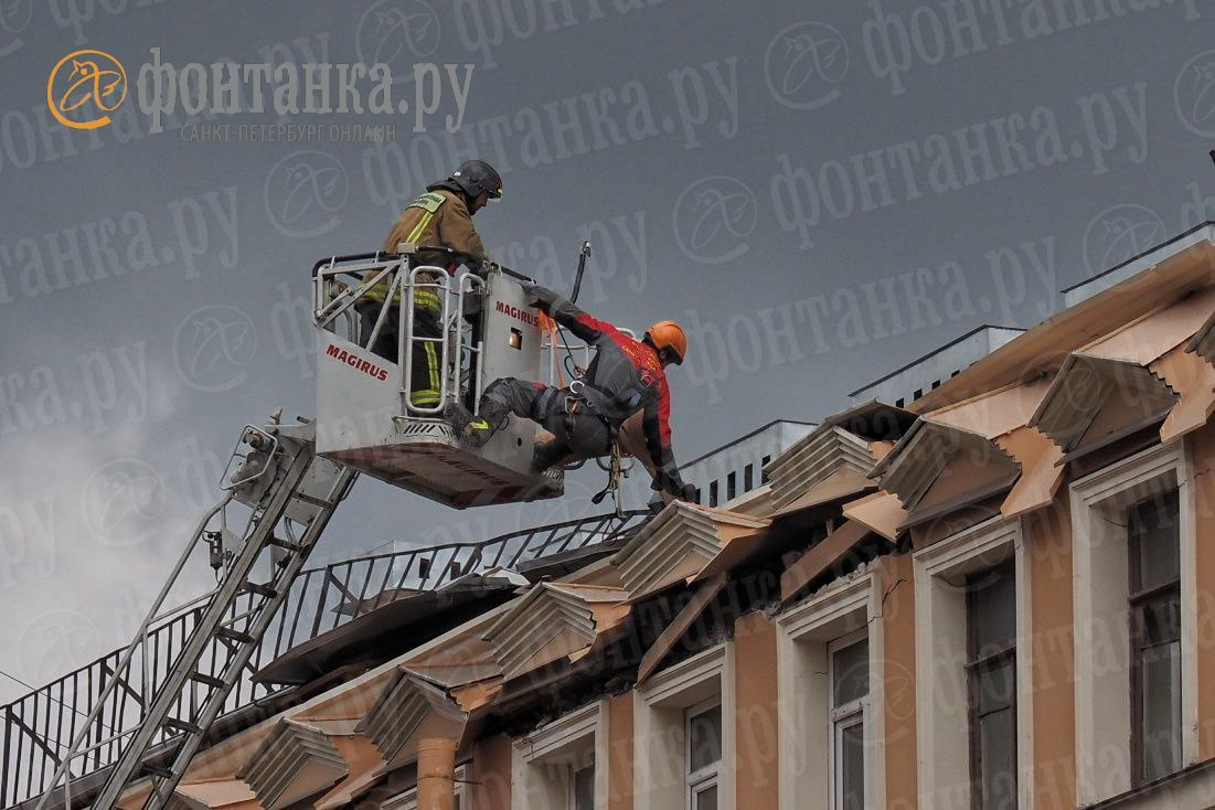 К полудню 5 августа сотрудники МЧС, работающие на Большой Зелениной, убрали оставшийся оголовок водосточной трубы и опасные нависающие элементы, передаёт фотокорреспондент «Фонтанки».