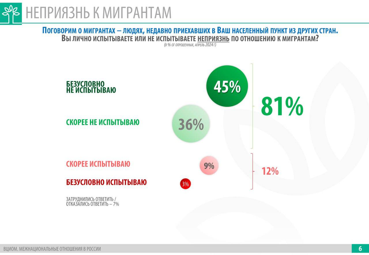 Главный вывод ВЦИОМ состоит в следующем: порядка 81% граждан России не беспокоит пребывание на территории нашей страны большого количества лиц других национальностей.