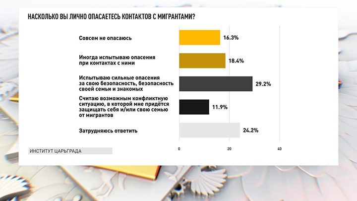 Недавний опрос Института Царьграда говорит совсем другое: почти 53% граждан России считают, что в ближайшее время там, где они живут, возможно возникновение конфликтов с мигрантами из Средней Азии. 59,5% респондентов в той или иной степени опасаются конфликтов с мигрантами. И лишь 16,3% не испытывают таких опасений.