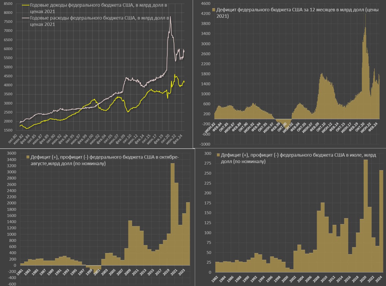 Новый финансовый 2025 год (окт.24-сен.25) начали крайне агрессивно с точки зрения бюджетного импульса – дефицит 257.5 млрд в окт.24, что является вторым по масштабу дефицитом за всю историю для октября после 284 млрд в окт.20 на фоне неограниченных антиковидных допингов и провала по доходам.