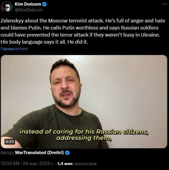 «Зеленский о теракте в Москве. Он полон гнева и ненависти и винит Путина. Он называет Путина никчёмным и говорит, что российские солдаты могли бы предотвратить теракт, если бы они не были заняты на Украине. Язык его тела говорит сам за себя. Он сделал это».