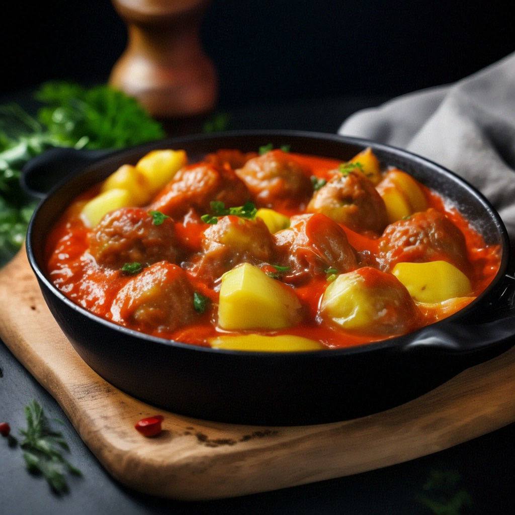 5. Заливаем протертыми томатами, приправаяем солью, перцем и хмели-сунели. Закидываем картошку, сверху фрикадельки, накрываем крышкой и тушим на огне ниже среднего минут 30.