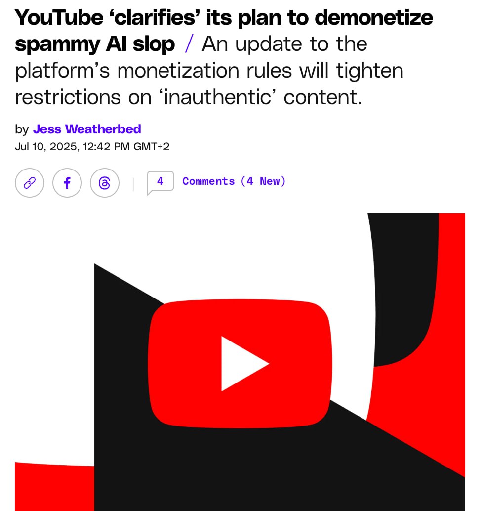 Без выручки рискуют остаться ролики с ИИ-озвучкой или кадрами из той же Veo 3 — в новых правилах с 15 июля появятся точечные ограничения для «ненастоящего» контента.