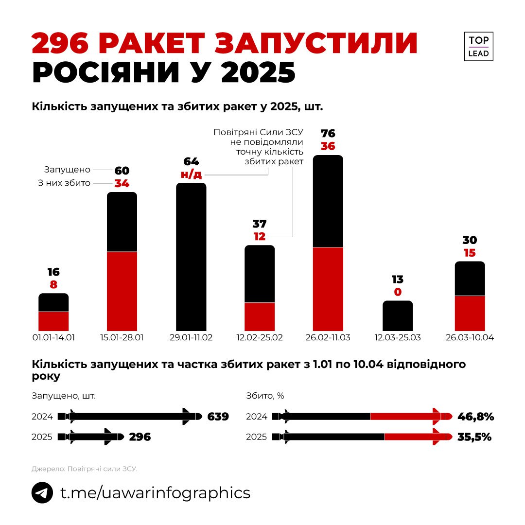 При этом количество ракетных атак снизилось: с начала 2025 года было запущено 296 ракет, в то время как за тот же период 2024 года — 639.