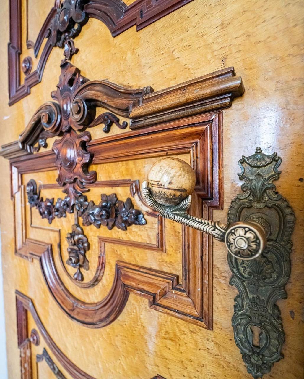 Как часто бывает в Питере, сохранность внутри отличная. Ручки на всех дверях выполнены в виде лапы с шаром – надо же было такое придумать! Говорят, Штакеншнейдер изначально придумал эту деталь как игру для своей дочери, а уже впоследствии стал использовать такие ручки в своих работах.