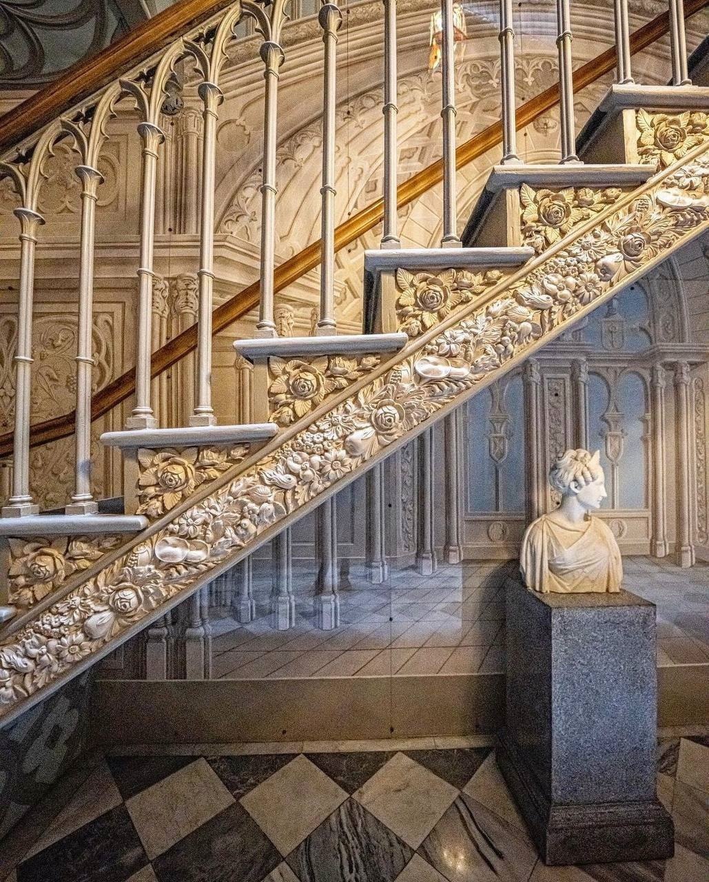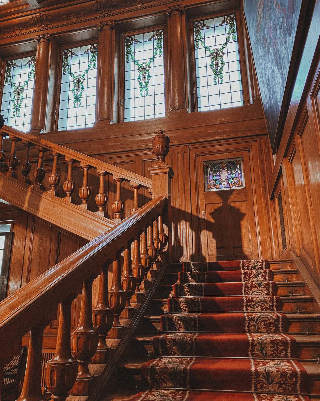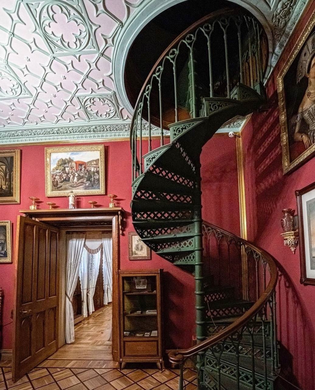 Чугунные балконы, эркеры, террасы, увитые виноградом, внутри - комнаты с готической отделкой, камины, витражные окна, маленькая винтовая лестница на второй этаж,и, конечно, же парадная чугунная лестница!