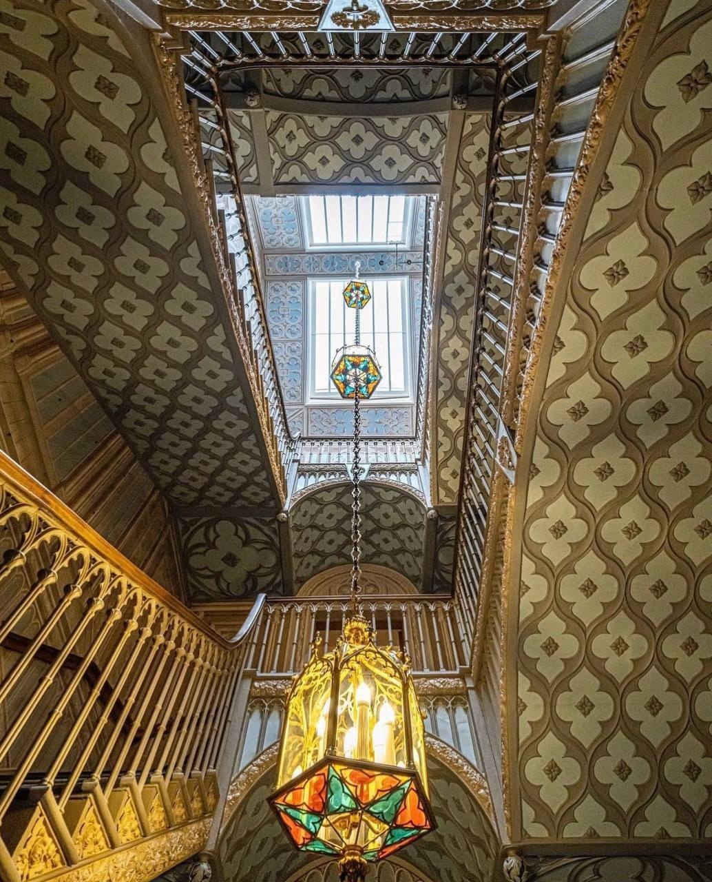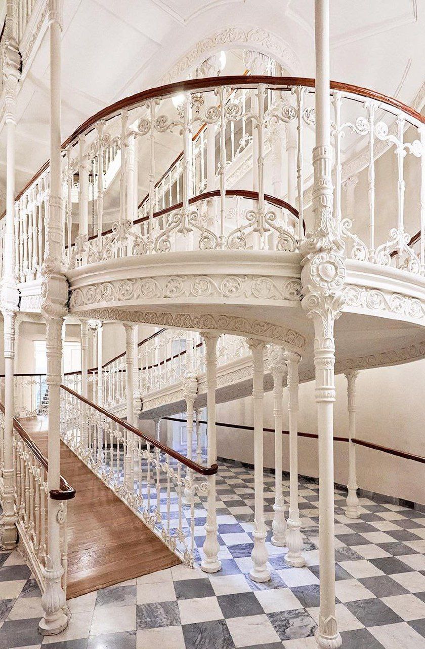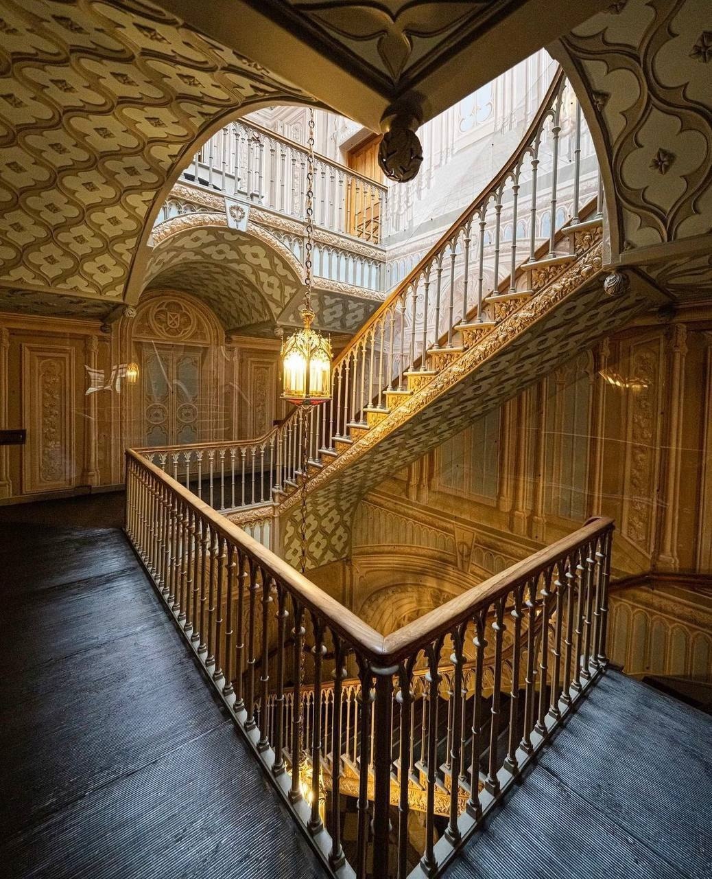 Чугунные балконы, эркеры, террасы, увитые виноградом, внутри - комнаты с готической отделкой, камины, витражные окна, маленькая винтовая лестница на второй этаж,и, конечно, же парадная чугунная лестница!