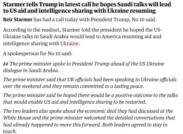 Премьер-министр Британии заявил, что «надеется на положительный результат переговоров, который позволит возобновить американскую помощь и обмен разведданными».