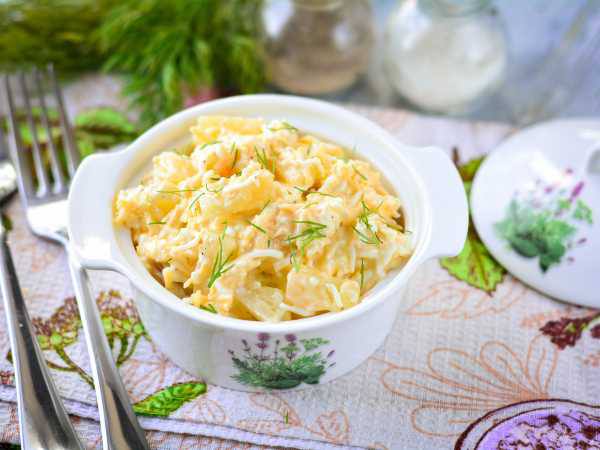 3․ Сложите всё в миску вместе с кукурузой. Посолите, поперчите и заправьте майонезом.