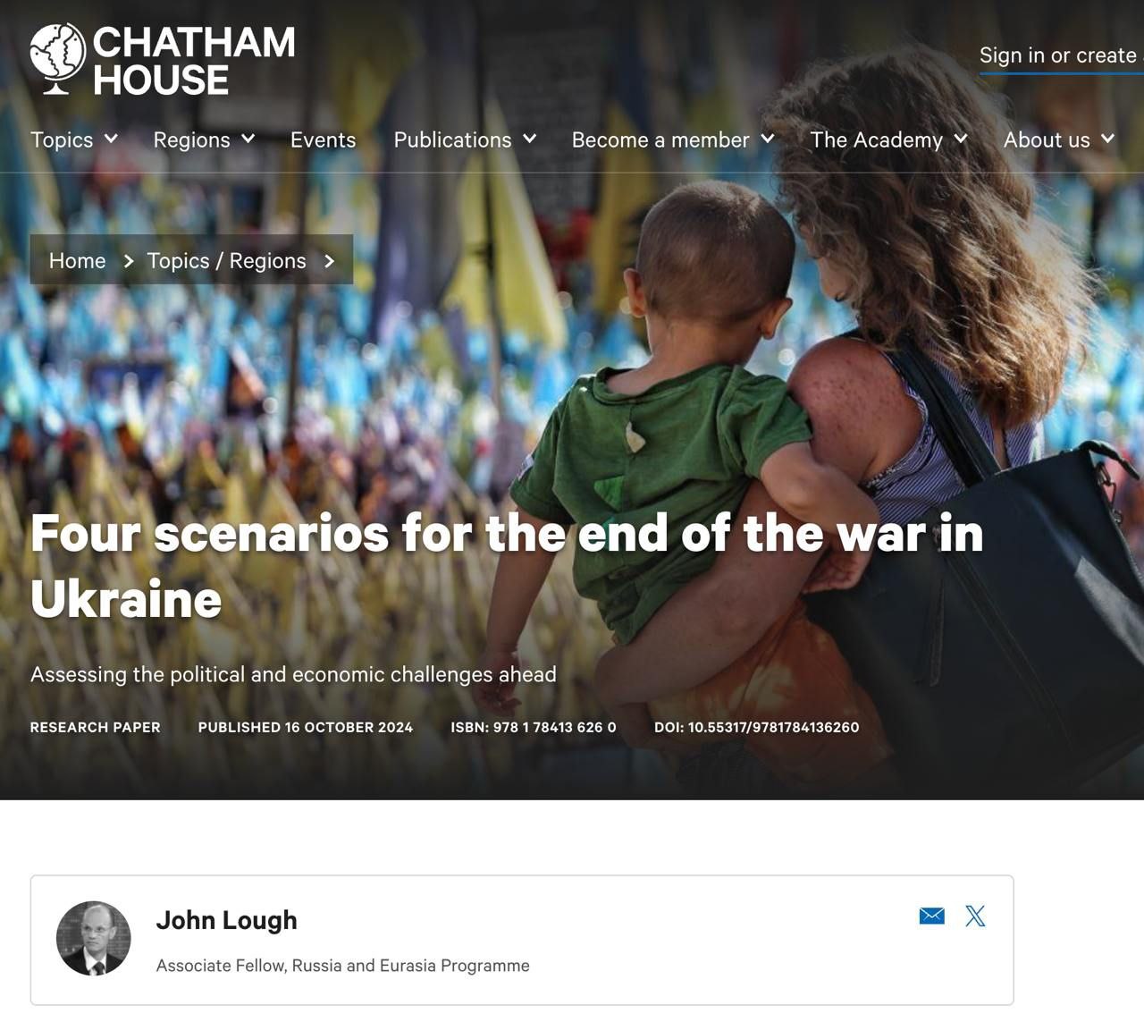На сайте Chatham house (Королевский институт международных отношений) накануне выступления там Валерия Залужного вышла колонка Джона Лафа о четырех сценариях развития войны в Украине.