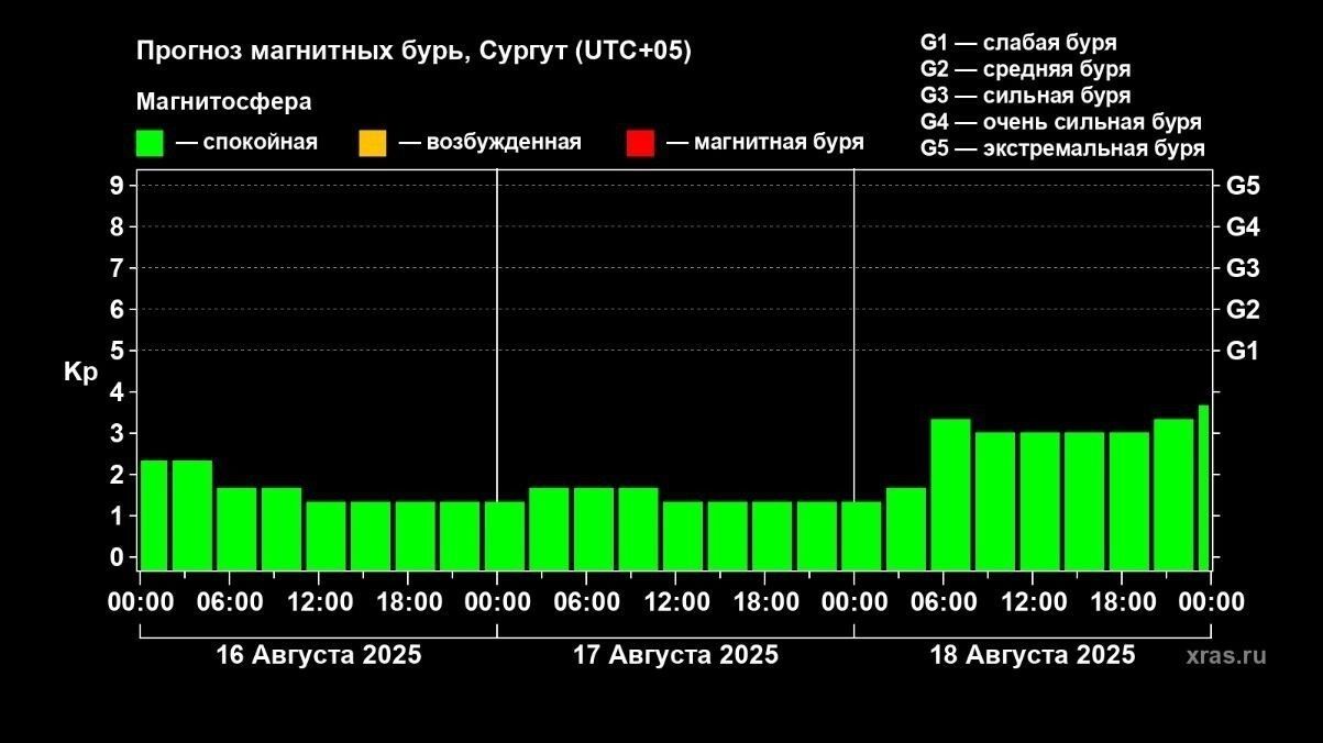 В субботу, 16 августа, метеобстановка в Югре впервые за последние дни будет точно стабильной: вероятность бури — минимальна. Это следует из ежедневного прогноза Лаборатории солнечной астрономии ИКИ и ИСЗФ.