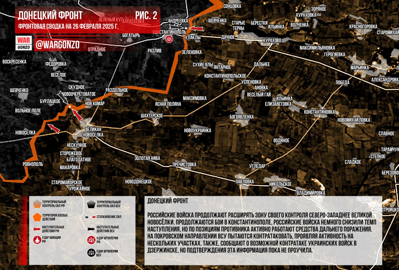 Донецкий фронт. Российские войска продолжают расширять зону своего контроля северо-западнее Великой Новосёлки. Продолжаются бои в Константинополе, российские войска немного снизили темп наступления, но по позициям противника активно работают средства дальнего поражения. На Покровском направлении ВСУ пытаются контратаковать, проявляя активность на нескольких участках. Также, сообщают о возможной контратаке украинских войск в Дзержинске, но подтверждения эта информация пока не получила. (Рис. 2)