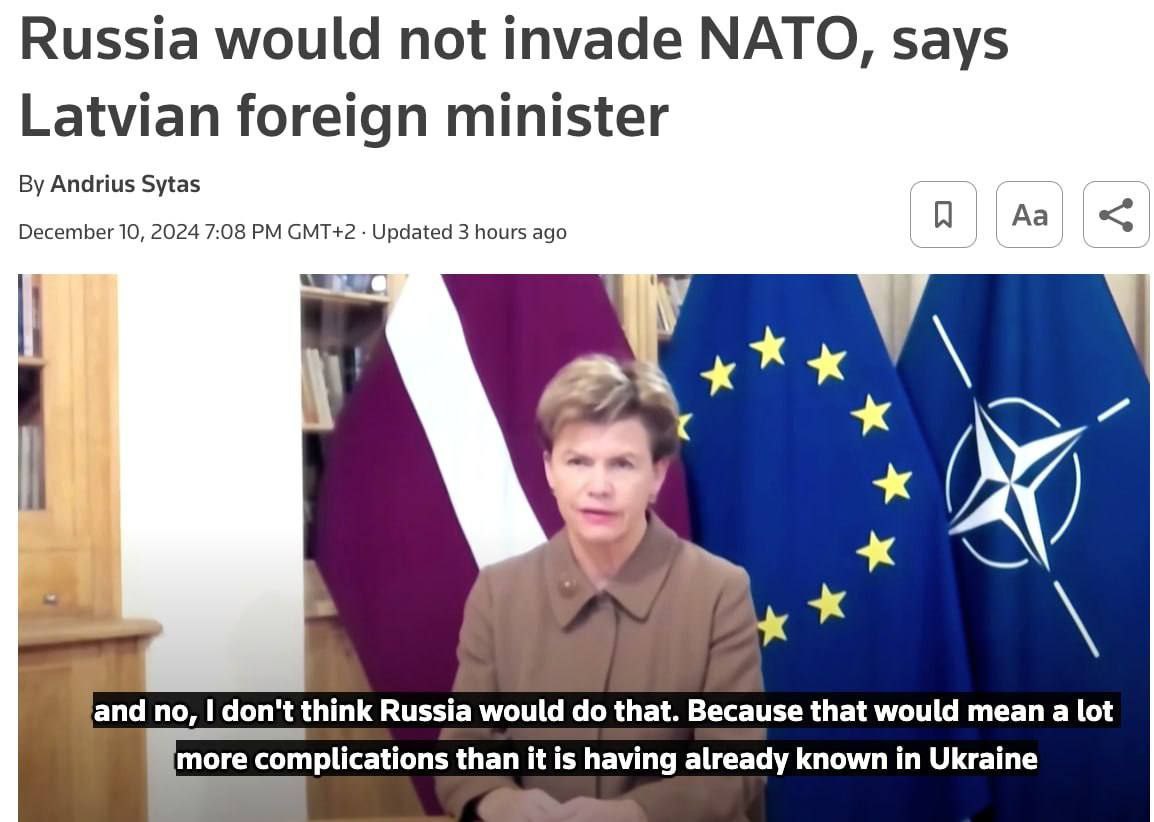 "Вы спрашиваете, боюсь ли я, что Россия вторгнется в НАТО. Нет, я не думаю, что Россия пойдет на это, потому что это будет означать гораздо больше осложнений, чем уже есть на Украине", — отметила Браже.