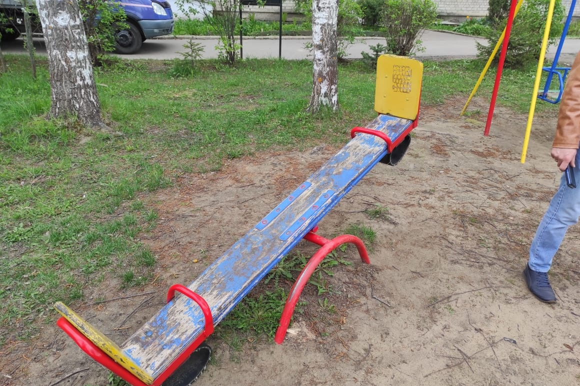 Также в плохом состоянии оказалась и детская игровая площадка этого дома. Проверка выявила отслоение древесины на элементах, отслоение краски и зацепы на сиденье качели.