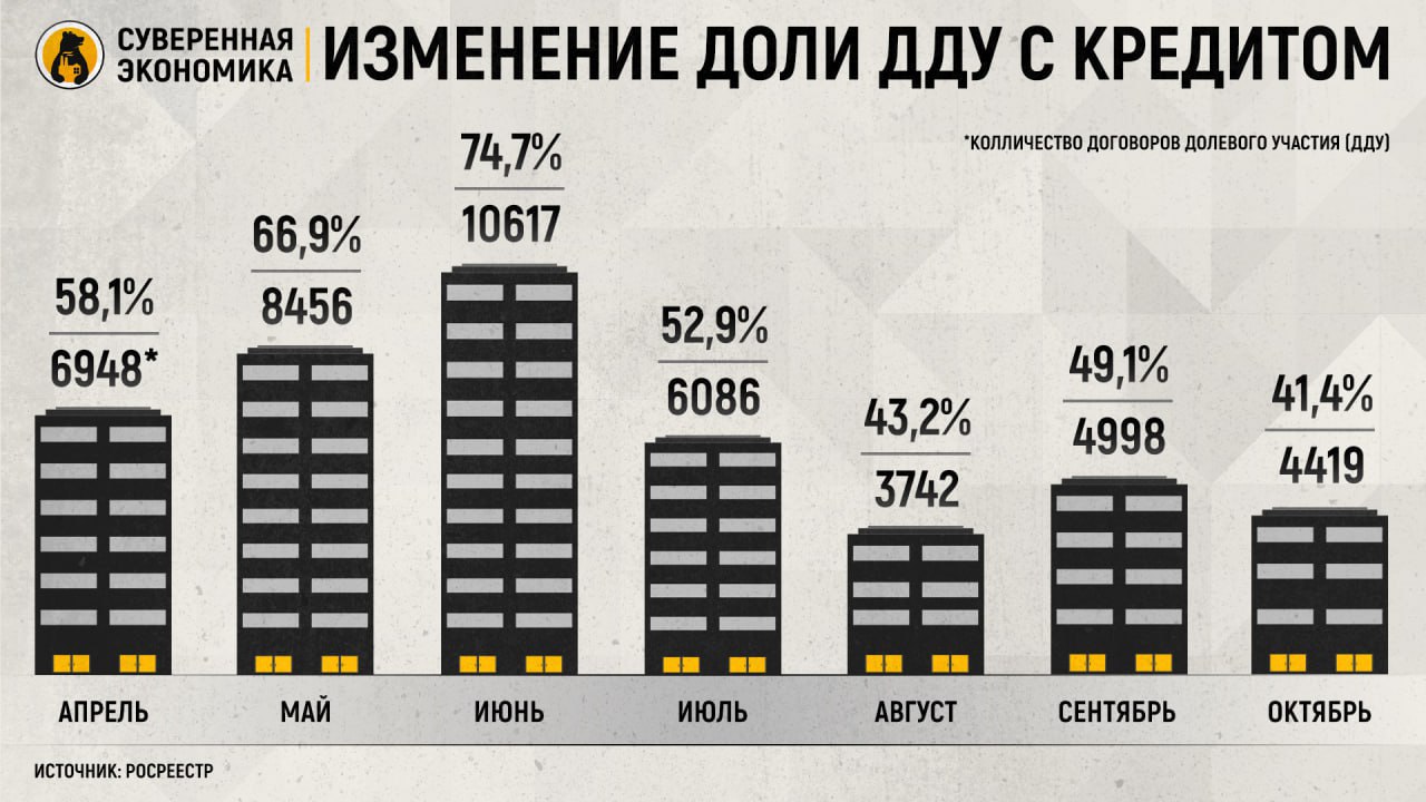 Π ΠΎΡΡΠ΅Π΅ΡΡΡ ΠΎΠΏΡΠ±Π»ΠΈΠΊΠΎΠ²Π°Π» Π΄Π°Π½Π½ΡΠ΅ ΠΎ ΡΠ΅Π³ΠΈΡΡΡΠ°ΡΠΈΠΈ Π΄ΠΎΠ³ΠΎΠ²ΠΎΡΠΎΠ² Π΄ΠΎΠ»Π΅Π²ΠΎΠ³ΠΎ ΡΡΠ°ΡΡΠΈΡ (ΠΠΠ£) Π² ΡΡΡΠΎΠΈΡΠ΅Π»ΡΡΡΠ²Π΅ ΠΆΠΈΠ»ΠΎΠΉ ΠΈ Π½Π΅ΠΆΠΈΠ»ΠΎΠΉ Π½Π΅Π΄Π²ΠΈΠΆΠΈΠΌΠΎΡΡΠΈ ΠΏΠΎ ΠΠΎΡΠΊΠ²Π΅ Π² ΠΎΠΊΡΡΠ±ΡΠ΅. Π‘Π°ΠΌΡΠΌ ΠΈΠ½ΡΠ΅ΡΠ΅ΡΠ½ΡΠΌ ΠΌΠΎΠΌΠ΅Π½ΡΠΎΠΌ ΡΡΠ°Π»ΠΎ ΡΠ½ΠΈΠΆΠ΅Π½ΠΈΠ΅ Π΄ΠΎΠ»ΠΈ ΡΠ΄Π΅Π»ΠΎΠΊ Ρ ΠΏΡΠΈΠ²Π»Π΅ΡΠ΅Π½ΠΈΠ΅ΠΌ ΠΊΡΠ΅Π΄ΠΈΡΠ½ΡΡ ΡΡΠ΅Π΄ΡΡΠ² Π² Π½ΠΎΠ²ΠΎΡΡΡΠΎΠΉΠΊΠ°Ρ Π΄ΠΎ ΠΌΠΈΠ½ΠΈΠΌΠ°Π»ΡΠ½ΠΎΠ³ΠΎ Π·Π° 2024 ΠΏΠΎΠΊΠ°Π·Π°ΡΠ΅Π»Ρ Π² 41,4%. ΠΠ»ΠΈΠΆΠ°ΠΉΡΠ΅Π΅ ΠΊ ΡΡΠΎΠΌΡ Π·Π½Π°ΡΠ΅Π½ΠΈΠ΅ Π±ΡΠ»ΠΎ Π² Π°Π²Π³ΡΡΡΠ΅ β 43,2%. Π ΠΌΠ°ΠΊΡΠΈΠΌΡΠΌ ΠΌΡ ΡΠ²ΠΈΠ΄Π΅Π»ΠΈ Π² ΠΈΡΠ½Π΅ β 74,7%.