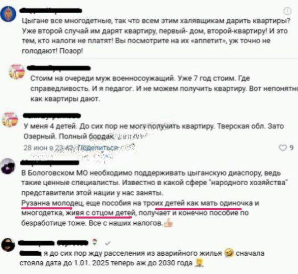 У счастливой цыганки Рузанны трое детей, она многодетная мать-одиночка, хотя, как утверждают пользователи соцсетей, проживает вместе с отцом детей, c которым она фиктивно развелась. Так же супруга военнослужащего, семья которого 7 лет стоит в очереди не понимает, как же так повезло Рузанне и её предприимчивой семье.