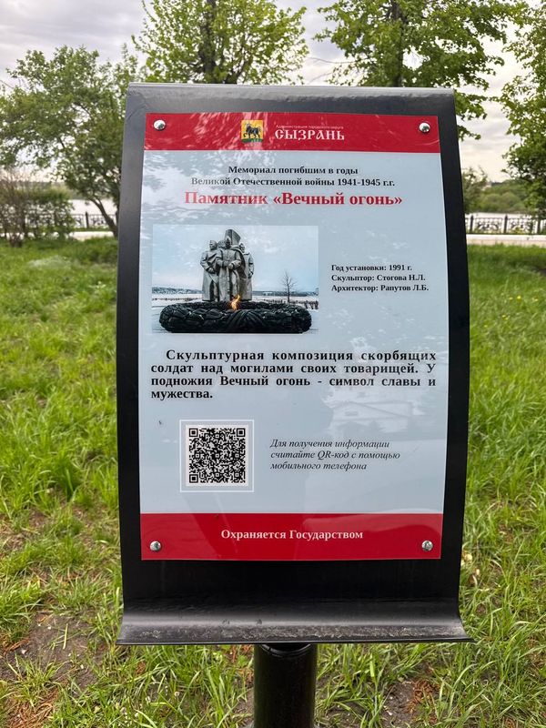 Особое внимание привлекают стойки на территории мемориального комплекса. Они установлены у братских захоронений воинов, умерших в сызранских госпиталях в годы Великой Отечественной войны, у монумента погибшим воинам-интернационалистам и у Вечного огня. Изображение украшает герб Сызрани. Надпись на стойке поясняет идейное содержание знакомого каждому сызранцу памятника воинам, склонившимся в скорбном молчании у могил павших товарищей. QR-код на стойке ведет на сайт ЦМИиК, где любой желающий сможет прочесть подробную информацию об объекте, которые вызвал его интерес.