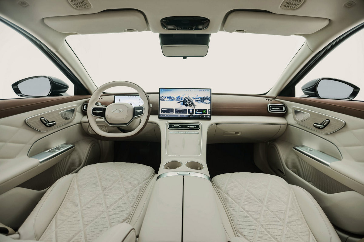 В салоне установлены отдельные экраны приборки и мультимедийной системы. Кроме того, наряду со стандартной пятиместной версией седану обещано четырехместное исполнение: между задними креслами такого Chery Fulwin A9 будет массивная «тумба» с пультом и отсеком для мелочевки, плюс между спинками нашлось место для холодильника.