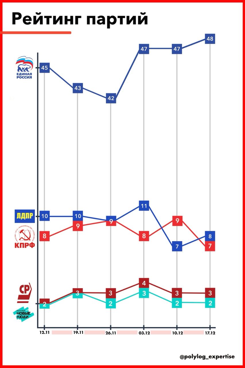 📌В партийной гонке ЕР продолжает рост — 48%. Партия успела провести съезд по поддержке выдвижения Владимира Путина на новый срок, выбрала идеальную для освещения мероприятия площадку — выставку-форум «Россия» на ВДНХ и добилась участия и выступления президента. КПРФ вновь теряет вторую строчку — рейтинг партии 7%. Обсуждение вокруг кандидата в президенты от коммунистов затянулось, а возможное участие в выборах депутата Харитонова, очевидно, менее популярного, чем, к примеру, лидер партии Зюганов или «красные» губернаторы Клычков и Коновалов, лишь снижает интерес электората. ЛДПР вернула себе вторую строчку — 8%. СРЗП и НЛ без изменений — 3% и 2% соответственно.