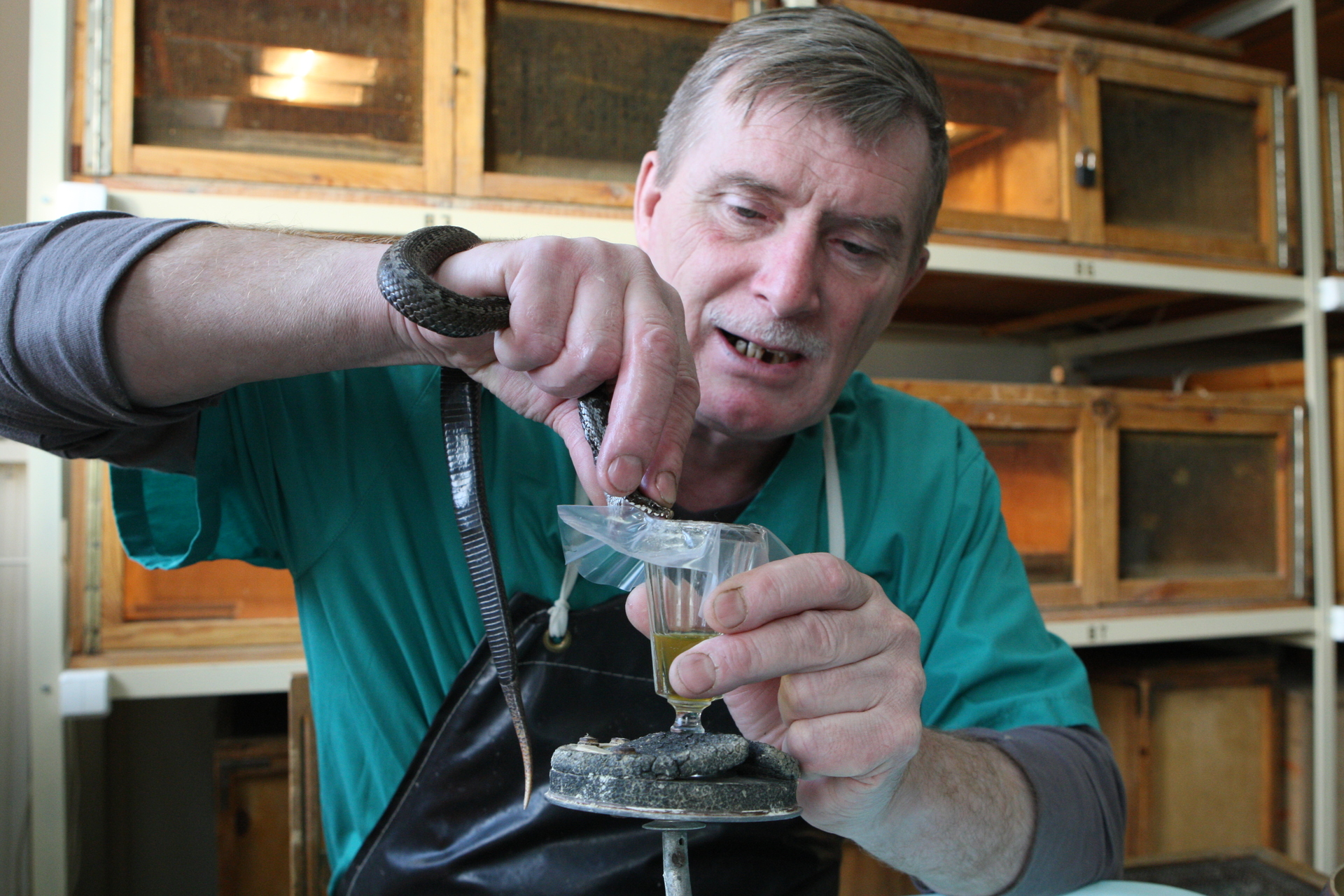 - Герпетолог ООО "Сибирский серпентарий" Александр Писарев во время отбора яда у гадюки