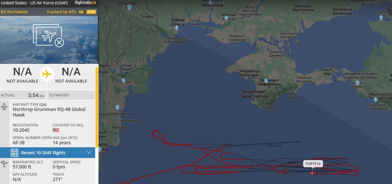 π΄ ΠΠΌΠ΅ΡΠΈΠΊΠ°Π½ΡΠΊΠΈΠΉ Π±Π΅ΡΠΏΠΈΠ»ΠΎΡΠ½ΠΈΠΊ RQ-4 Global Hawk Π½Π° ΠΏΡΠΎΡΡΠΆΠ΅Π½ΠΈΠΈ Π²ΡΠ΅Π³ΠΎ Π΄Π½Ρ Π΄Π΅ΠΆΡΡΠΈΡ Ρ ΠΏΠΎΠ±Π΅ΡΠ΅ΠΆΡΡ ΠΡΡΠΌΠ°. ΠΠΎΠ½Π° Π½Π°Π±Π»ΡΠ΄Π΅Π½ΠΈΡ β ΠΎΡ ΠΡΡΠΌΡΠΊΠΎΠ³ΠΎ ΠΌΠΎΡΡΠ° Π΄ΠΎ Π‘Π΅Π²Π°ΡΡΠΎΠΏΠΎΠ»Ρ.
