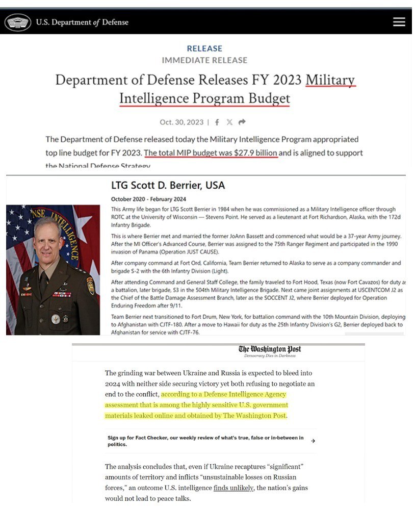 Газета The Washington Post писала, что, по агентурным данным РУМО, Россия и Украина не пойдут на переговоры и конфликт продолжится в 2024 году. Другой любопытный момент: именно РУМО тогда докладывало наверх о конфликте между Зеленским и главкомом ВСУ Залужным. То есть американцы уже знали об этом и готовились к замене Залужного более чем за полгода до отставки «украинского мясника».