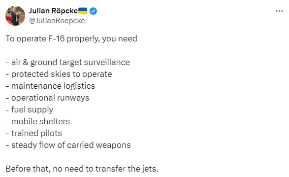 Немецкий журналист Юлиан Рёпке, известный своими антироссийскими взглядами, назвал условия, которые позволят ВСУ успешно применять американские боевые самолёты: