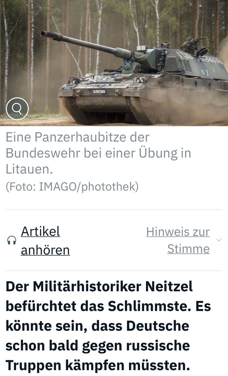 Военный немецкий историк Сёнке Нейцель считает , что бундесверу скоро придется вступить в войну против российских войск. "Мы не можем исключать, что немецким солдатам придется сражаться через несколько лет, чтобы защитить территорию НАТО", - сказал он в интервью Шпигелю